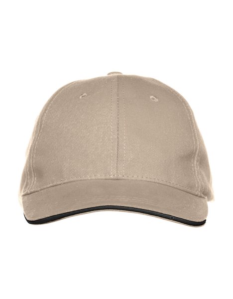 Barnkeps med delvis kontrastfärgad skärm, “sandwich piping" och justerbart mässingspänne.