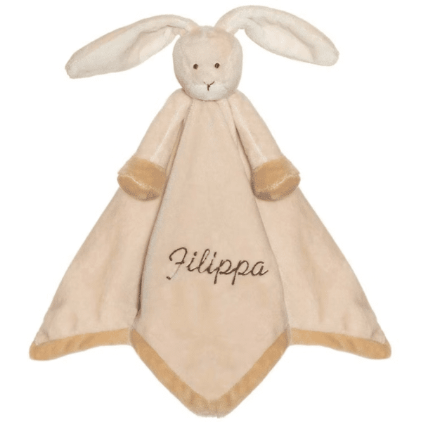 En ljust beige kanin, snuttefilt, från Teddykompaniet. Dinglisar är mycket poppis.
